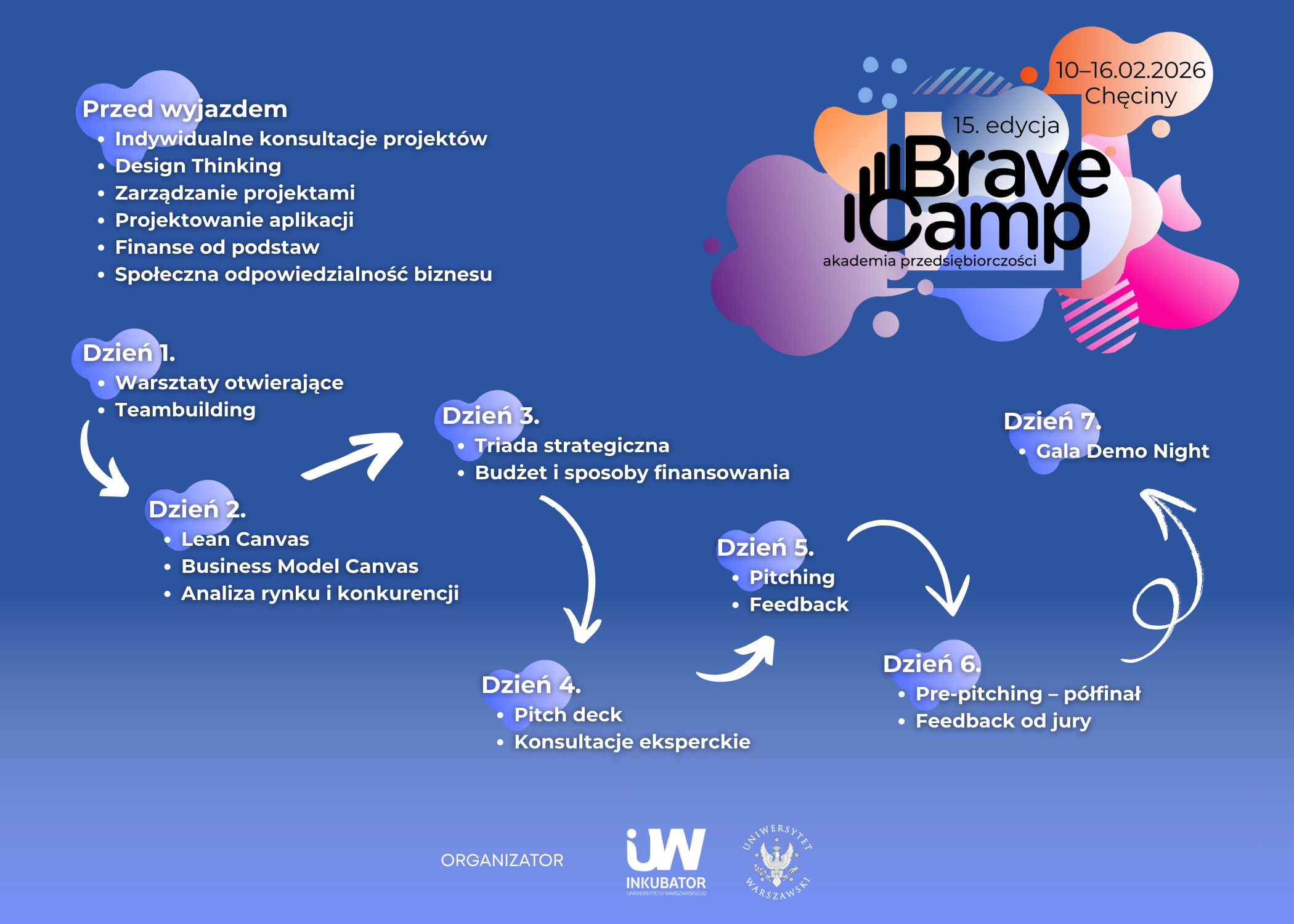 BraveCamp – Akademia Przedsiębiorczości to inicjatywa skierowana do studentów i doktorantów Uniwersytetu Warszawskiego oraz Warszawskiego Uniwersytetu Medycznego.